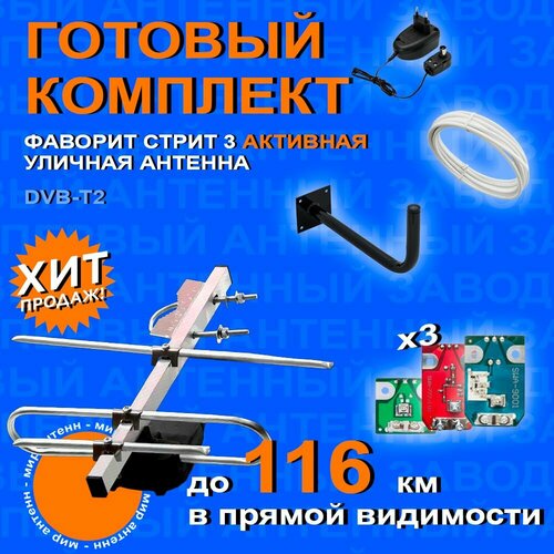 "Комплект для цифрового ТВ: Уличная антенна Фаворит Стрит 3 с кабелем, с усилителем 9001 777, блоком питания и кронштейном" / антена для телевизора