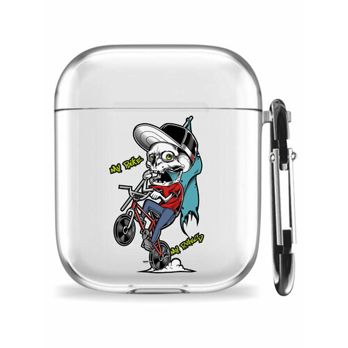Силиконовый чехол Mcover для беспроводных наушников AirPods 1/2, с карабином, глянцевый, Скелет на влосипеде V.1