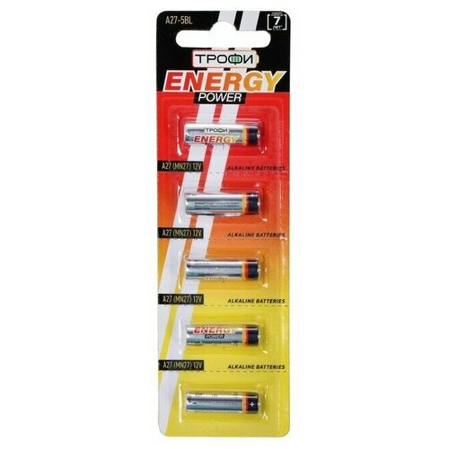 Батарейка алкалиновая "Трофи" Alkaline, А27 (MN27)-5BL, 12В, блистер, 5 шт.