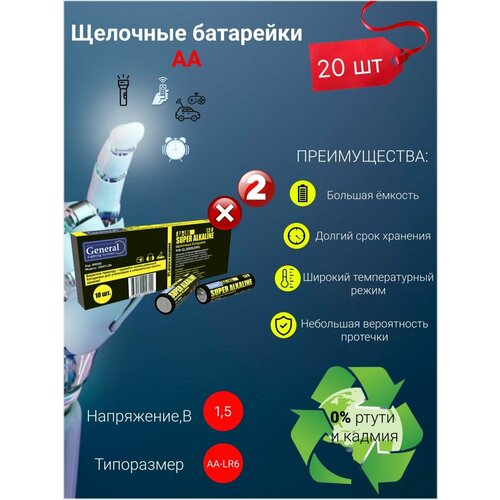 General, Батарейка , Количество 20 шт, Химический тип Щелочной, Форм-фактор LR6 AA