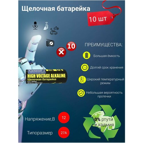 General, Батарейка , Количество 10 шт, Химический тип Щелочной, Форм-фактор 27А