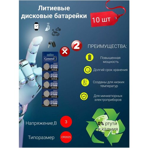 General, Батарейка , Количество 10 шт, Химический тип Литиевый, Форм-фактор CR2025