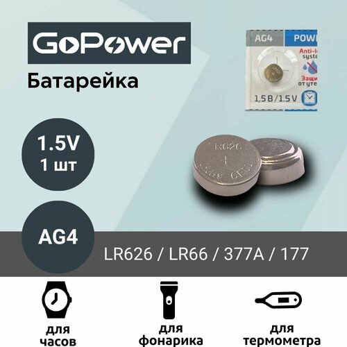Батарейка GoPower AG4 (LR626, LR66, 377A, 177) Alkaline 1.55V (1 шт)