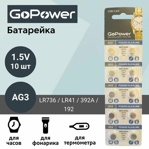 Батарейка GoPower AG3 (LR736, LR41, 392A, 192) Alkaline 1.55V (10 шт)