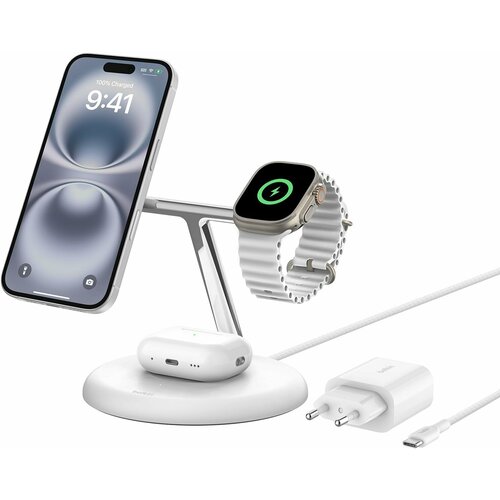 Беспроводная зарядная станция Belkin BoostCharge Pro 3-в-1 с MagSafe, белая