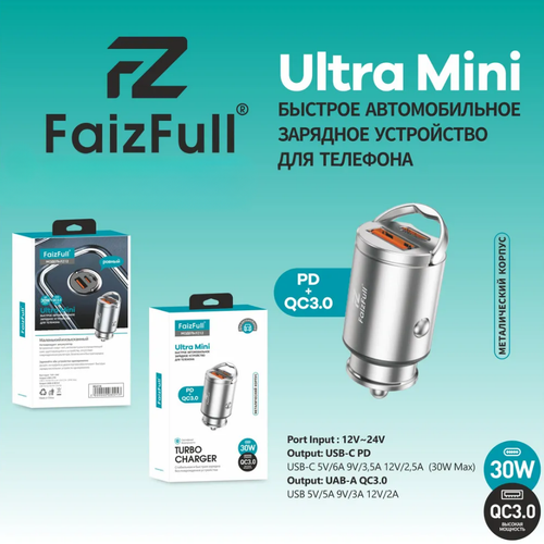 Автомобильное зарядное устройство FaizFull Ultra Mini от прикуривателя 12V-24V / Быстрая зарядка 30W с 2 портами (USB Type-C) и (USB Type-A) / Gray