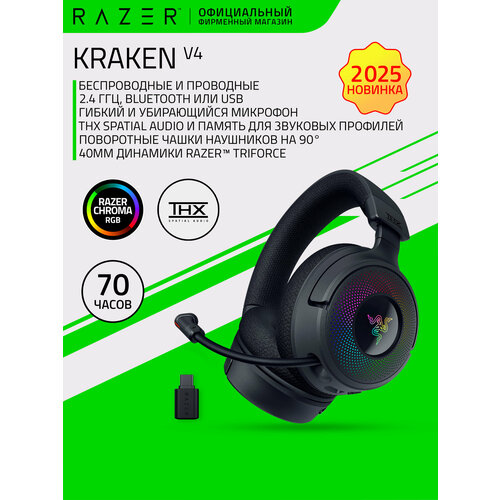 Игровые наушники Razer Kraken V4, Беспроводные и Проводные, 2.4ГГц Bluetooth USB 40 мм динамики, звук THX, RGB подсветка