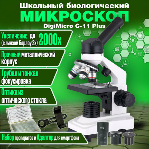Биологический школьный микроскоп 2000x с микропрепаратами в кейсе DigiMicro Erudit C-11 Plus