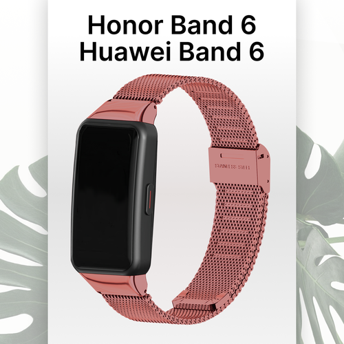 Металлический ремешок для смарт часов Honor Band 6 и Huawei Band 6 / Браслет миланская петля для умных часов Хонор Бэнд 6 и Хуавей Бэнд 6 / Розовый