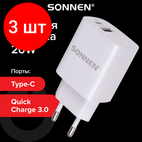 Комплект 3 шт, Зарядное устройство быстрое сетевое (220В) SONNEN, порты USB+Type-C, QC3.0, 3 А, белое, 455505
