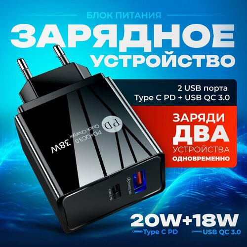 Сетевое зарядное устройство для телефона, 2 USB порта Type C PD + USB QC 3.0, быстрая зарядка для iphone 20 Вт, черная