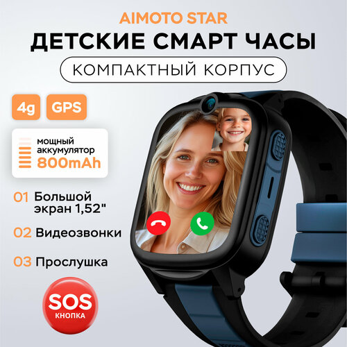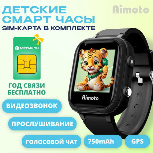 Часы умные детские с сим картой 4g и прослушкой Aimoto Omega + SIM с видеозвонком, камерой, функцией телефона, часы детские смарт для мальчиков и девочек, Черный черный