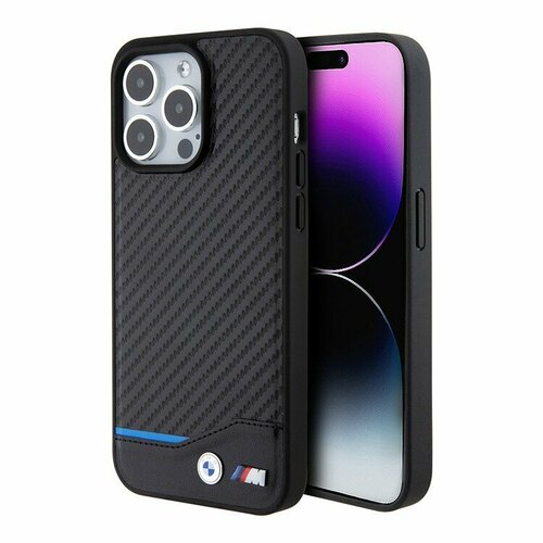 BMW чехол для iPhone 15 Pro Max, M-Collection PU-кожа с текстурой карбона и голубой полоской (MagSafe)