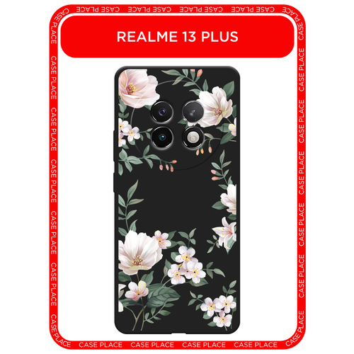 Черный матовый чехол на Realme 13+ / Реалми 13+ с принтом Beautiful white flowers