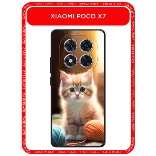 Черный матовый чехол на Poco X7/Xiaomi Redmi Note 14 Pro 5G / Поко X7 с принтом Рыжий котёнок с клубком