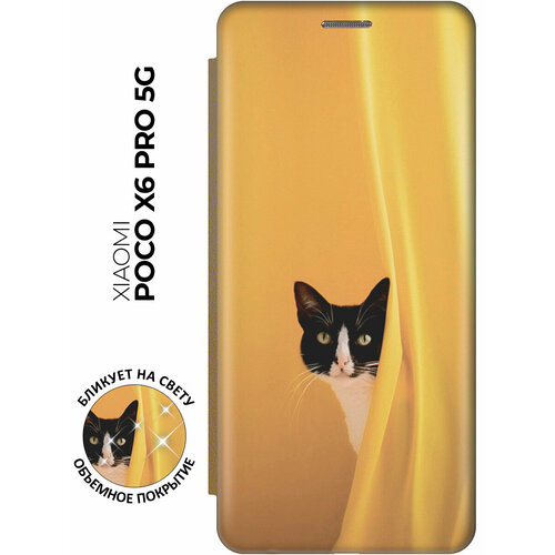 Чехол-книжка на Xiaomi Poco X6 Pro 5G / Сяоми Поко Х6 Про 5г с рисунком "Выглядывающий котик" золотой