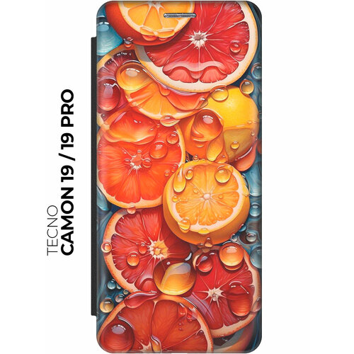 Чехол-книжка на Tecno Camon 19 / 19 Pro / Техно Камон 19 / 19 Про с рисунком "Сочные апельсины в каплях" черный
