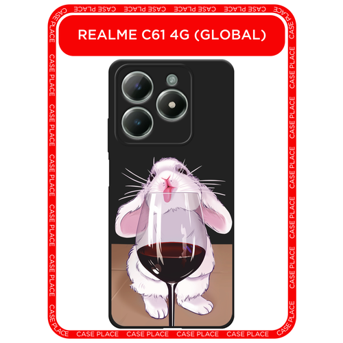 Черный матовый чехол на Realme C61 4G (Global) / Реалми C61 4G с принтом Кролик облизывает бокал