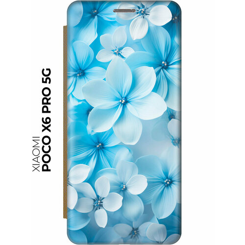 Чехол-книжка на Xiaomi Poco X6 Pro 5G / Сяоми Поко Х6 Про 5г с рисунком "Бело-голубые цветы" золотой