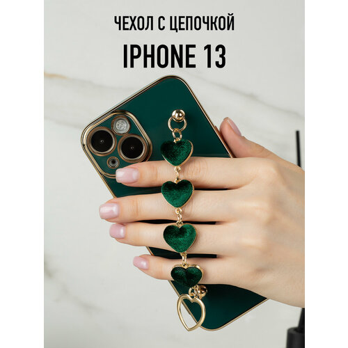 Глянцевый силиконовый чехол на iPhone 13 с цепочкой из сердечек