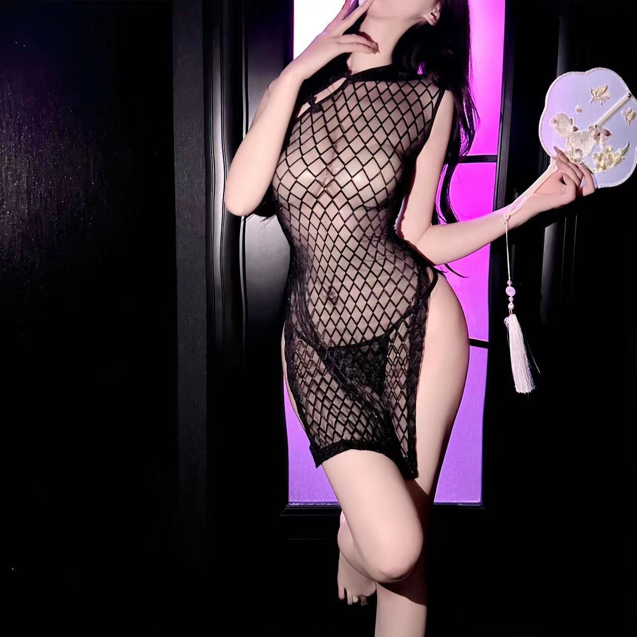 Сексуальное нижнее белье сексуальное ретро полое чонсам горячее после сетчатой перспективы соблазнения униформа костюм женщины One size 67665f994b44