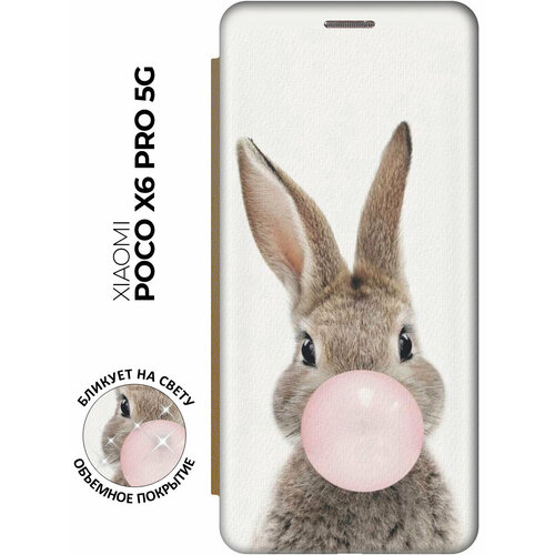 Чехол-книжка на Xiaomi Poco X6 Pro 5G / Сяоми Поко Х6 Про 5г с рисунком "Заяц с жвачкой" золотой