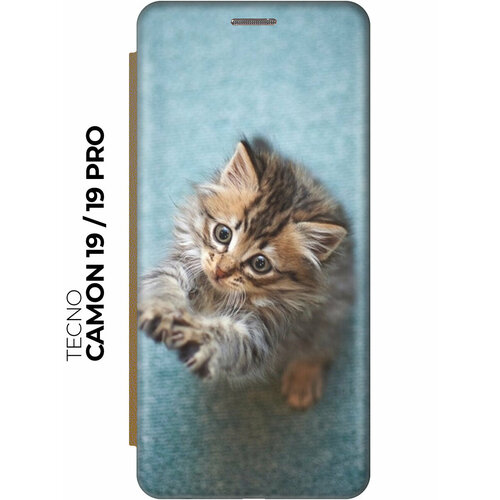 Чехол-книжка на Tecno Camon 19 / 19 Pro / Техно Камон 19 / 19 Про с рисунком "Котёнок на голубом" золотой
