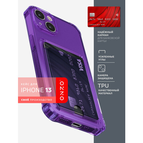 Чехол на Айфон 13 противоударный с карманом для карт прозрачный фиолетовый iPhone 13 чехол