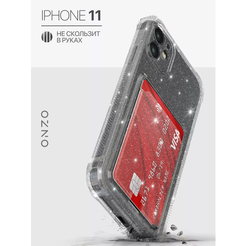 Защитный чехол для iPhone 11 с усиленными углами / Бампер на Айфон 11 с картхолдером, прозрачный с блестками