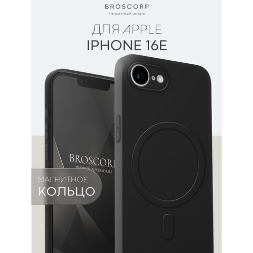 Матовый силиконовый чехол Broscorp на Apple iPhone 16E (Айфон 16е), тонкий, с магнитным кольцом, soft-touch, черный