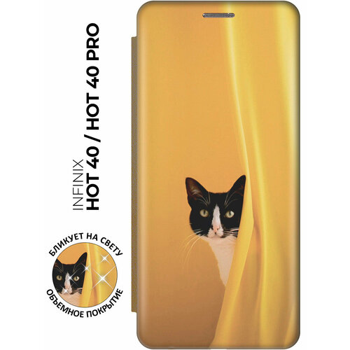 Чехол-книжка на Infinix Hot 40 / Hot 40 Pro / Инфиникс Хот 40 / Хот 40 Про с рисунком "Выглядывающий котик" золотой