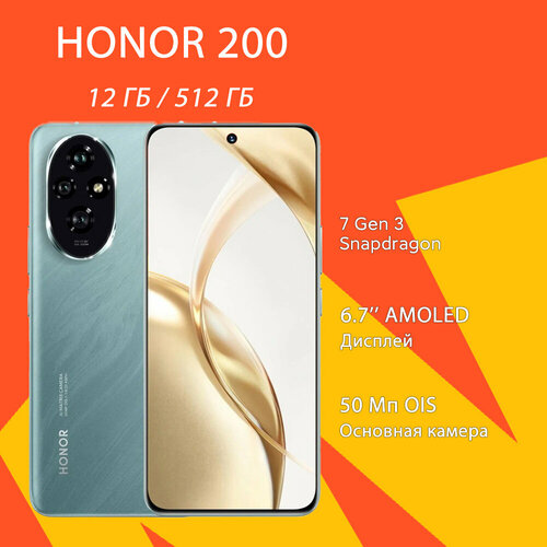 Смартфон Honor 200, 12/512 ГБ, экран 6,7", Изумрудно - Зеленый, EAC (Ростест)