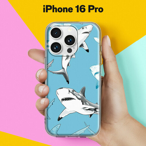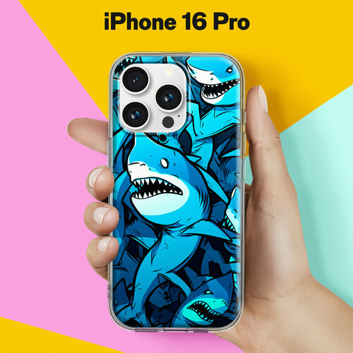 Силиконовый чехол на iPhone 16 Pro с принтом "Акулы злые" с прозрачными бортиками
