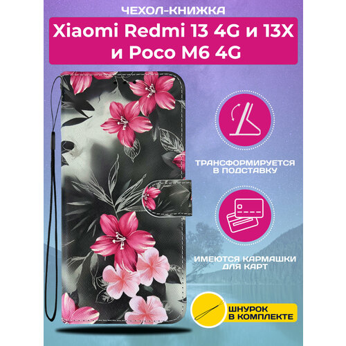 Чехол книжка wallet case на Xiaomi Redmi 13 4G и Redmi 13X и Poco M6 4G с рисунком (Цветы лилии)