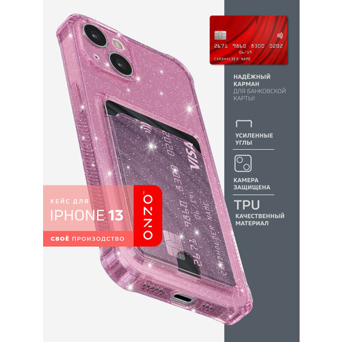 Чехол на Айфон 13 противоударный с карманом для карт прозрачный розовый с блестками iPhone 13 чехол