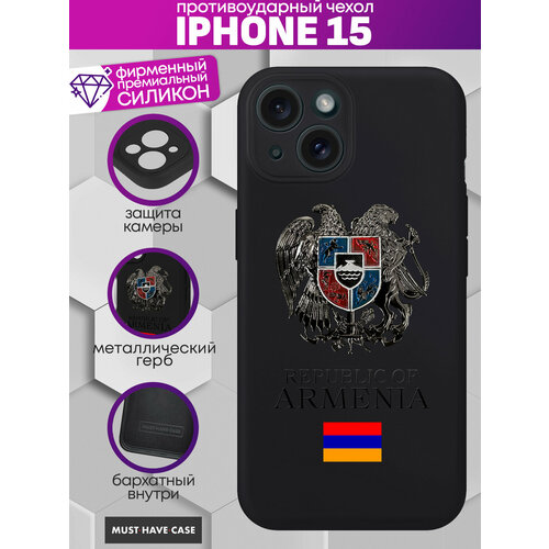 Чехол на iPhone 15 Премиум с Серебристым металлическим Гербом Армении