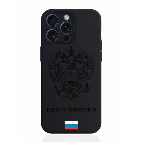 Чехол на iPhone 15 Pro Max силиконовый Черный лаковый Герб России с флагом