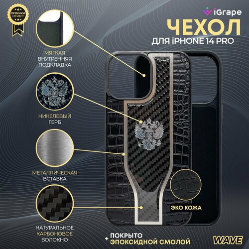 Чехол с гербом РФ кожа-карбон Wave для iPhone 14 Pro, iGrape (Черный) / чехол на айфон 14 про