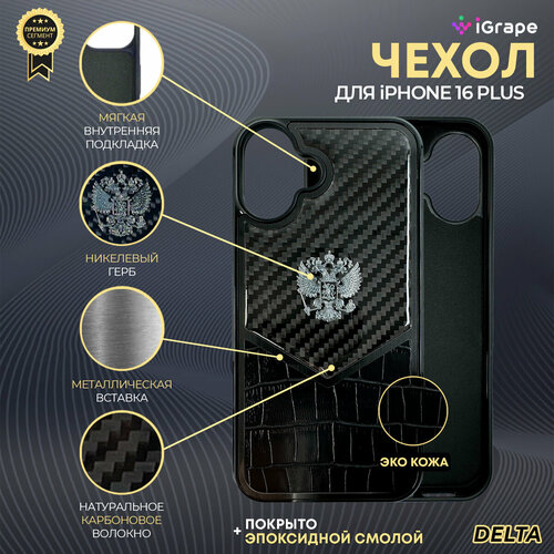 Чехол с гербом РФ кожа-карбон Delta для iPhone 16 Plus, iGrape (Черный) / чехол на айфон 16 плюс