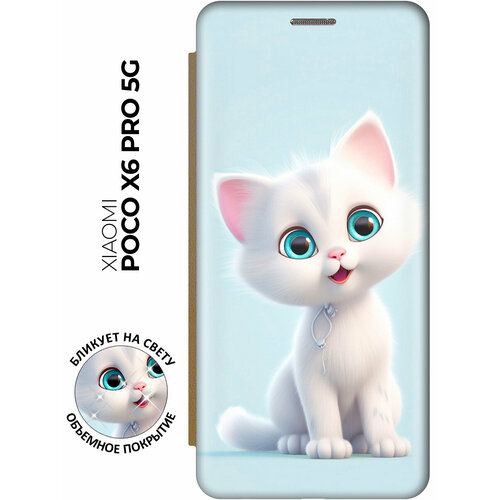 Чехол-книжка на Xiaomi Poco X6 Pro 5G / Сяоми Поко Х6 Про 5г с рисунком "Котёнок на голубом" золотой
