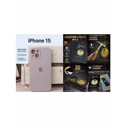 Чехол и защитное стекло для Iphone 15 с закрытой камерой, цвет серо-фиолетовый
