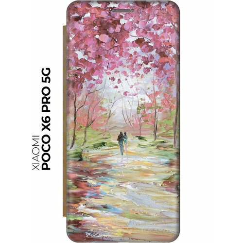 Чехол-книжка на Xiaomi Poco X6 Pro 5G / Сяоми Поко Х6 Про 5г с рисунком "Весенняя роща" золотой