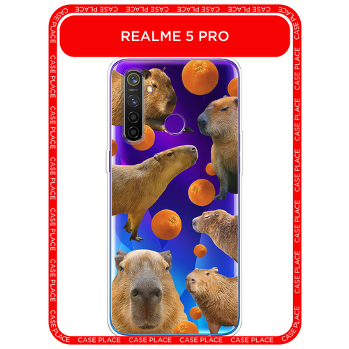 Чехол на Realme 5 Pro / Реалми 5 Про с принтом Капибара и апельсины, прозрачный