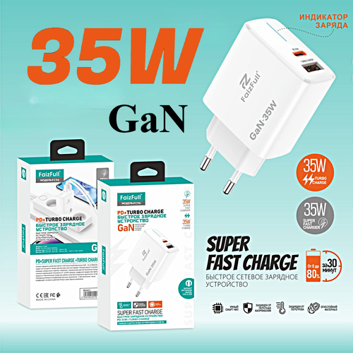 Зарядка Type C, Type-A, GaN зарядка 35W, для IOS, Android, блок питания, быстрая зарядка, зарядка для айфона, 2 разъёма
