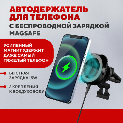 Держатель для телефона автомобильный магнитный, на воздуховод с зарядкой MagSafe, 9 см черный