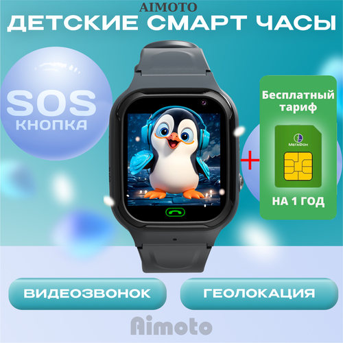 Часы умные детские с сим картой 4g и прослушкой Aimoto Omega + SIM с видеозвонком, камерой, функцией телефона, часы детские смарт для мальчиков и девочек, Черный