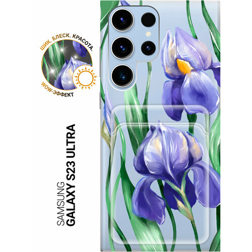 Силиконовый чехол на Samsung Galaxy S23 Ultra с принтом "Удивительные ирисы" с карманом для карты прозрачный