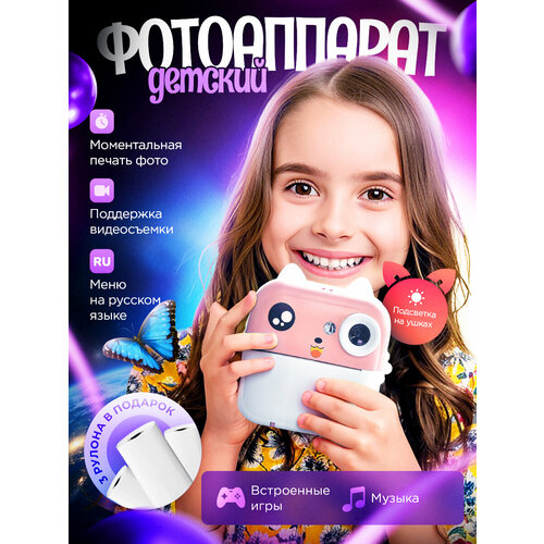 Детская камера моментальной печати Print Camera, печать фото с телефона, поддержка приложения Fun Print, розовый котик