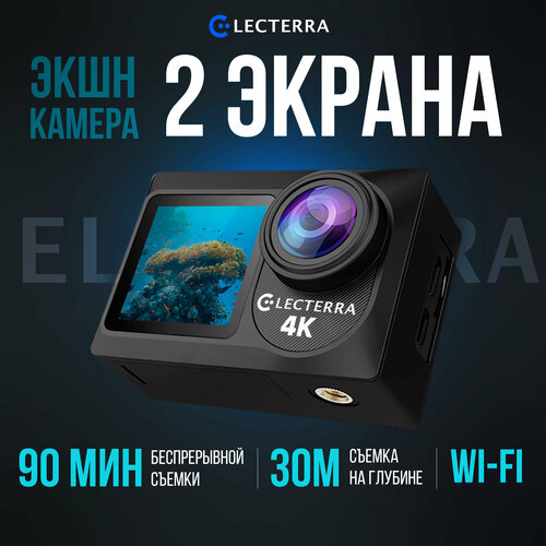 Экшн-камера Electerra 2К 1440p Super HD 30 fps (4K с интерполяцией). Водонепроницаемая экшн камера c 2 экранами, с креплениями и водонепроницаемым кейсом