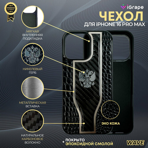 Чехол с гербом РФ кожа-карбон Wave для iPhone 16 Pro Max, iGrape (Черный) / чехол на айфон 16 про макс